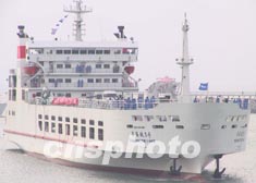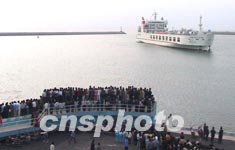 中國第一艘跨海火車輪渡“粵海鐵一號”,25日上午已經停泊在粵海鐵路通道南港防波堤外,預計下午進入南港開始與船、橋、港對接。海南百姓聚集在碼頭上等待粵海鐵一號與海南土地的第一次親密接觸。作者:關向東