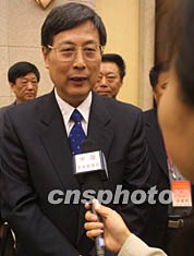 全國政協常委、民進中央副主席黃孟復二十六日在中華全國工商業聯合會九屆一次執委會上,當選為全國工商聯主席。圖為黃孟復主席接受記者采訪。作者:史利