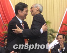 中華全國工商業聯合會九屆一次執委會完成了新老主席的交替工作。二十七日,在北京京西賓館舉行的全國工商聯第九次會員代表大會閉幕式上,新當選的黃孟復主席(左)與原主席經叔平(右)在熱烈的掌聲中緊緊擁抱。作者:史利