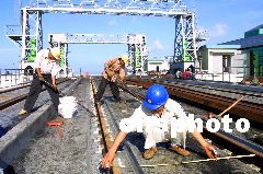 12月2日,隨著最后一根長25米的特制鐵軌,成功鋪設在粵海鐵路南港棧橋橋面,全長8738米的粵海鐵路南港棧橋鐵軌與海口火車站鐵軌接軌。至此,中國第一條跨海鐵路粵海鐵路南北港碼頭鐵路線全線貫通。圖為施工人員在南港棧橋上進行測量和鋪軌工作。古月 攝