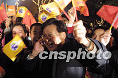 三日晚,在摩納哥夢特卡洛舉行的國際展覽局第132次會議上,中國上海通過激烈竟爭獲得2010年世界博覽會主辦權,當中國申博成功的喜訊從蒙特卡洛傳來的時候,上海全城沉浸在一片歡樂之中。圖為申城市民在為中國申博成功歡呼。作者:湯彥俊