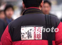 張藝謀執導的首部武俠電影《英雄》本月中旬將在北京舉行全球首映式。首映前夕,一位男士身穿貼有《英雄》廣告的冬裝在街頭行走。這部電影的宣傳攻勢可見一斑。作者:張煒