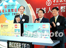 中銀香港總裁劉金寶博士、副總裁林炎南及中銀卡(國際)有限公司總經理蘇誠信,12月17日主持儀式,推介香港發行的首張人民幣信用卡。洪少葵 攝