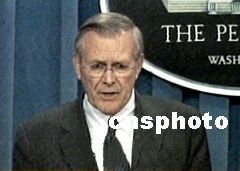 十七日,美國總統布什宣布,他已經下令軍方著手部署導彈防御系統,以預防大規模殺傷性武器造成的“災難性破壞”。國防部官員稱,布什政府計劃到2004年在阿拉斯加州格里利堡部署首批10枚陸基攔截導彈。圖為美國防部長拉姆斯菲爾德介紹這個導彈防御系統。中新社 攝