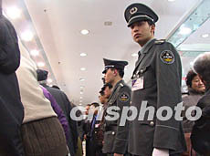十九日是北京黃金產品正式銷售的第二天,仍有大批市民冒雪前往購買金條。由于人太多,商場保安層層護衛購金隊伍。作者:王麗南