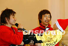 香港歌星方力申、鄧建泓,12月20日在香港禮賓府與少年兒童一起演唱圣誕歌曲及玩游戲。洪少葵 攝