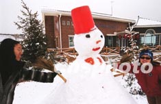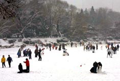 上午11點,陶然亭公園潔白的湖面成了公園人氣最旺的地方。人們在冰面上滾雪球、堆雪人、打雪仗、滑冰車。走在公園的小路上,你會跟許多形狀滑稽的雪人不期而遇,它們相貌各異,有的頭插一串鮮花,有的脖子系著五彩繽紛的布條,有的頭頂一片綠色柏樹枝。一群中學生玩雪的創意更是獨特:將數十個拳頭大的雪球串在一棵桃樹的樹枝上,遠遠望去,仿佛滿樹盛開著鮮花。