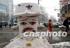 鬧市街頭堆起一座士兵雪人,為即將來臨的圣誕節和元旦節增添情趣。作者:賈國榮