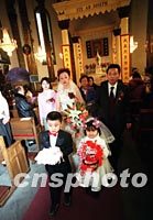 教堂婚禮已成為北京新婚夫婦追求的一種新時尚。圖為一對新人在王府井教堂舉行了神圣而儉仆的婚禮。中新社記者 史利 攝