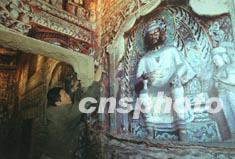 包括大同云崗石窟在內的中國二十八處世界自然、文化遺產復制品歲末將在北京集中展出,以紀念《世界遺產公約》簽訂三十周年。圖為工作人員在云崗石窟展區作最后的布置。作者:張勤