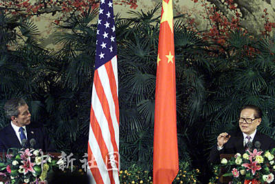 國家主席江澤民與美國總統(tǒng)布什二十一日在北京共同會見中外記者,這是繼APEC上海峰會以來兩國元首第二次共同會見記者。作者:滿會喬