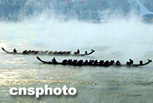 吉林龍舟賽在零下二十多度嚴寒江面上進行