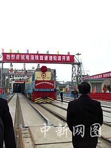 今天上午十時,一艘白色巨輪緩緩駛向北港港池,十時十分,巨輪穩穩停靠在北港停泊位,十時二十一分,粵海鐵一號上的鐵軌與陸地棧橋鐵軌成功對接,十時三十分,在機車牽引下,第一節渡海火車車箱開上海口南港棧橋。十點四十六分,中共中央政治局常委、國務院副總理吳邦國在棧橋火車前為粵海鐵路正式開通剪彩。