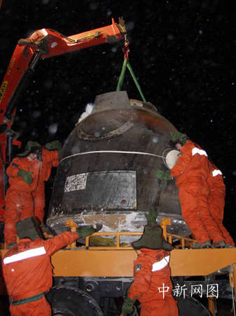 返回艙在內蒙古草原著陸后,被吊裝入專用卡車沿公路運往北京。孫陽 攝