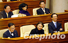 香港政務司長曾蔭權、財政司長梁錦松、律政司長梁愛詩等政府高官及立法會議員,1月8日出席立法會,聽取行政長官董建華發表施政報告。洪少葵 攝