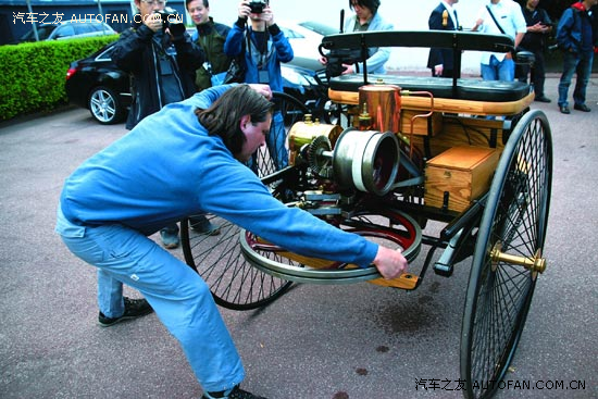 試乘完畢,漏的油似乎比用掉的多。這輛復制車還算精細,不知道120年前的奔馳1號是不是也這樣遺灑?盡管如此,“不用馬拉的車”也值得我們肅然起敬了