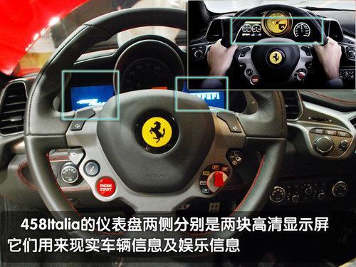 458Italia將儀表盤左右兩側設計了兩個高清晰的TFT顯示屏,在它們相應的左右兩側儀表臺的位置上分別有調節按鈕去控制它們的顯示內容,您可以選擇顯示車速、GPS信息、娛樂信息。特別的地方是通過這兩個顯示屏可以顯示車輛在運行中引擎、剎車片、輪胎的溫度是否正常,是否這三個重要的部件出現了過熱,這也意味著駕駛者通過儀表就可以了解到車輛此時是否已經達到駕駛極限。