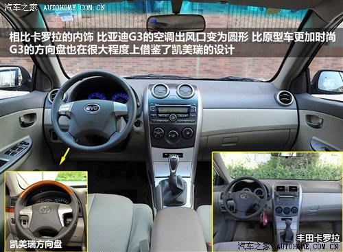 比亞迪F3的內(nèi)飾可以說是豐田花冠的翻版,因為除了方向盤的造型不同之外并沒有其他不同,便宜的售價也限制了用料和材質(zhì);作為F3升級產(chǎn)品的G3,在內(nèi)飾方面也同樣由花冠升級為卡羅拉,但并沒有照搬過來,比如空調(diào)出風口的變化就顯得比原型車更加時尚,四輻方向盤也明顯帶有豐田凱美瑞的影子。