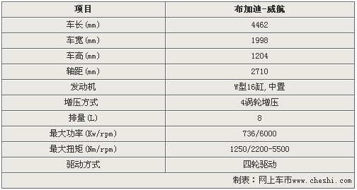 布加迪威龍(VEYRON)這個名字源自曾經駕駛布加迪57贏得1939利曼桂冠的Pierre Veyron。而16.4代表16個氣缸和4個渦輪增壓器。 這款車配備了大眾專門研發的W型16缸發動機,可以說是將兩臺V8發動機公用一根曲軸的產物。此外,該發動機還配備了4個渦輪增壓器。排量達到了7993cc?梢员虐l出736千瓦的最大功率,同時在極低的1000rpm時即可輸出730牛米的龐大扭矩,在2200rpm時就可以迸發出1250牛米的峰值扭矩,這種扭力會一直持續到5500rpm。