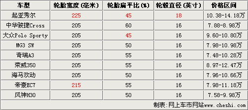 在以上車型之中,帝豪EC7系列全系都配備了215/55R16輪胎,各類尺寸參數都比較平均,所能影響的性能和舒適度在同級車中比較領先。另外,大眾Polo Sporty與秀爾一樣,是采用45較低扁平比的輪胎,提升了整車的運動氣質。大體來看,奇瑞A3、榮威350等偏重家用的車型,輪胎扁平比都偏高,而海馬歡動、MG3 SW等偏向運動的車型,扁平比則略低。
