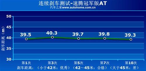 冠軍版與速騰其他車型相比剎車的優勢比較明顯,車重大于速騰1.4TSI,但實際的制動距離短了1米,寬胎起了直觀重要的作用,在剎車時輪胎與地面接觸面積大,保證了足夠的摩擦力;10次連續制動測試,冠軍版剎車系統表現出的穩定性也讓我們放心,距離偏差很小。