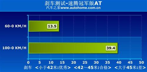 在眾多消費者的眼里德國車都很堅固,很安全,其實安全性不僅體現在眾多的電子輔助系統和氣囊數量上,車輛本身的性能才是保證安全的根本客觀因素;速騰冠軍版的制動性能也讓我們滿意。