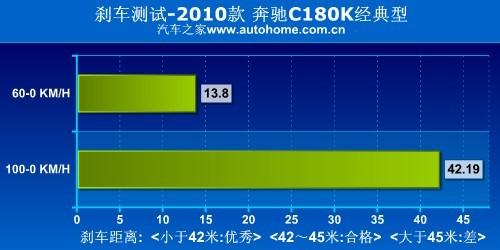 在我們對C180K的測試中,最終百公里加速時間為10.3秒,很遺憾沒有進入10秒以內,不過這個成績依然領先眾多2.4L自然吸氣發動機車型。剎車成績為42.19米,按說算是個不錯的成績,但是相比奔馳家族的其他兄弟,這個成績就顯得有待提高了。油耗的表現比較出色,8.74升/百公里的表現對于一款加速在10秒左右的中型車來說還是很優秀的。