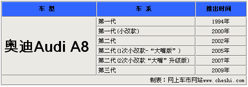 Audi A8是奧迪汽車的豪華旗艦車型,與其競爭對手梅賽德斯-奔馳S級以及寶馬7系相比,奧迪A8還很“年輕”。說起A8的歷史,自1994年推出至今僅有十余年,但不得不承認(rèn)的是奧迪A8成長的很快,從低調(diào)到張揚(yáng)大膽的創(chuàng)新設(shè)計(jì)引領(lǐng)了豪華轎車的發(fā)展方向。下面我們就一同來了解下這款“年輕”旗艦車型的歷史。