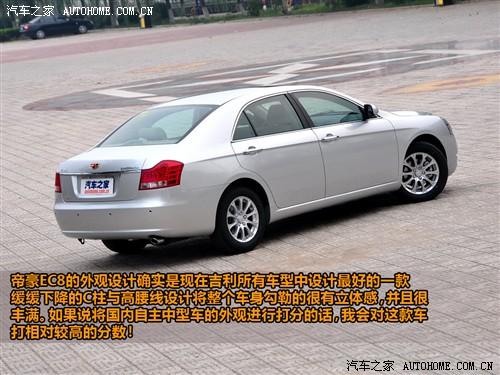 剛才說完了我對這款車的第一印象,下面我再和你說說我的第二印象:漂亮。請不要認為我是帝豪的車托,因此當你見到帝豪EC8的時候也會對這款車的優美的外形設計感到贊嘆。特別是從尾部以45°角看的時候更會讓你覺得它的線條很優美。此外,帝豪EC8的C柱設計的特別厚實且平緩,這樣就與后備箱很好的融合在一起。