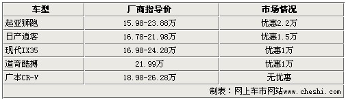 五款車型除了價格一直堅挺的CR-V以外,都有一定程度的價格優惠,而且全部過萬。這樣的營銷手段,對于本就十分火爆的SUV市場定會造成不小沖擊。從1萬到2.2萬的價格優惠,對于熱銷SUV來說還算厚道,特別是剛剛上市不久的現代IX35,僅上市幾個月就出現了1萬元的價格優惠,實屬不易。