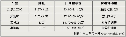 表中顯示清晰,沃爾沃XC90是四款車型中唯一一款出現優惠的車型,三個版本全部優惠10萬元,性價比表現比較突出;奔馳ML是四位對手中唯一一款加價車型,根據車型不同加價5-8萬元。寶馬X5和奧迪Q7銷售情況相對穩定,以廠商指導價銷售,但Q7 3.0TFSI等等時間較長,有5個月之多。
