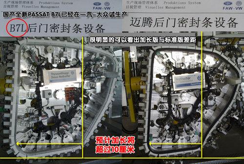 目前,加長版的PASSAT B7已經(jīng)在一汽-大眾長春的第二工廠進行了試生產(chǎn),在PASSAT B6(邁騰)的生產(chǎn)線上,我們發(fā)現(xiàn)了標有“B7L”字樣的后門密封條設備。與目前在產(chǎn)的標準軸距版邁騰相比,僅后門的長度就增加了10厘米左右,并且我們從工作人員那里也獲得了“B7L”是加長邁騰的肯定答案。由此可見,全新PASSAT B7加長版落戶一汽-大眾已成定局。