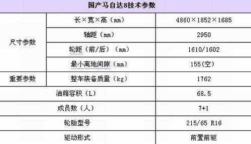 資料顯示,國產(chǎn)馬自達(dá)8的車身尺寸為長4860mm;寬1852mm;高1685mm,最多可以容納8人,遠(yuǎn)遠(yuǎn)超過B級轎車的2950mm軸距保證了足夠的后排空間。