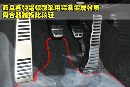 奧迪R8 4.2L敞篷版由于標配的是六速手動變速箱,油門、剎車以及離合器踏板都是采用輕量化的鋁制金屬材質,而且還配備了左腳休息踏板,離合器踏板的力度比較輕,但看上去制動踏板有些偏小,并沒有經過特殊的設計。