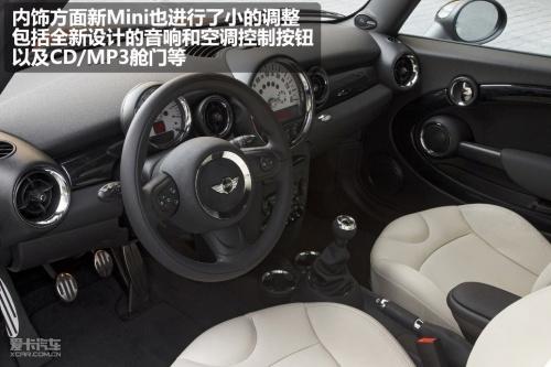 內(nèi)飾方面新MINI也進(jìn)行了小的調(diào)整,其中包括全新設(shè)計(jì)的音響和空調(diào)系統(tǒng)控制按鈕、以及CD/MP3艙門等。配置方面將增加升級版收音機(jī)、MP3/CD播放器、AUX接口微型導(dǎo)航儀、彩色行車電腦顯示器、藍(lán)牙和USB音頻接口等。