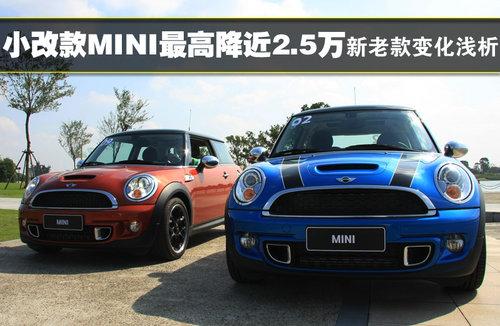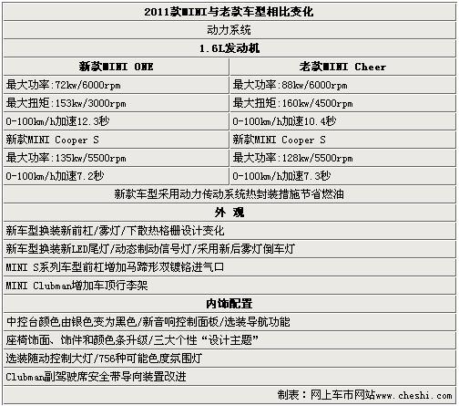 2011款MINI并非全新換代車型,為中期改款。主要的配置變化體現在外形設計、動力系統以及內飾三大方面。售價22.5萬元的MINI ONE與老款的MINI Cheer相比在發動機功率方面下降了16KW,而新款MINICooper s發動機功率則提升7KW換來的是快0.1秒的百公里加速時間。在配置方面,新款車型于老款車型相比略有提升,但是并不明顯,主要變化還是體現在設計方面 。