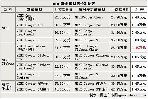 小改款的寶馬MINI全系車型于日前正式在國內上市,2011款MINI分別搭載3個發動機系列One、Cooper和Cooper S的8個車型,共10款車。新車型在設計以及動力系統方面進行了升級,售價區間為22.5-41.5萬元與老款車型相比最高降幅接近2.5萬元。通過下面的對比解析我們一同來了解下新老款MINI在價格以及其它方面究竟有哪些主要的變化。