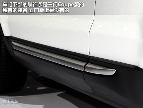 車身側面線條是其設計的一大看點,凸起的腰線挺拔清晰,逐漸上揚貫穿整個車身。前翼子板處的散熱口真正發揮作用的面積很小,更多的是為提升美觀服務。車門下部的裝飾條是三門Coupe版的獨有的裝備,五門版上是沒有的。