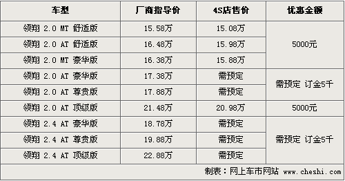 筆者從北京地區經銷商處了解到,目前領翔全系優惠幅度仍然保持在5000元。據店內銷售人員介紹,除2.0舒適型和豪華型有部分現車供應外,其他款仍需要預訂,訂金為5000元,15個工作日內便可以交車。目前銷售的領翔在原來車型基礎上增加了2.0自動舒適與2.0手動豪華兩款車,并在配置上有一定調整。消費者可到店內試駕體驗,了解詳細車型情況。