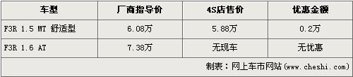 據(jù)比亞迪汽車北京地區(qū)4S店銷售人員介紹,目前北京在售的比亞迪F3R有兩款車型。1.5L手動(dòng)舒適版經(jīng)2000元的優(yōu)惠后售價(jià)從6.08萬(wàn)降到了5.88萬(wàn)元,1.6L自動(dòng)檔車型目前店內(nèi)沒(méi)有現(xiàn)車,所以不再此次優(yōu)惠隊(duì)列中。