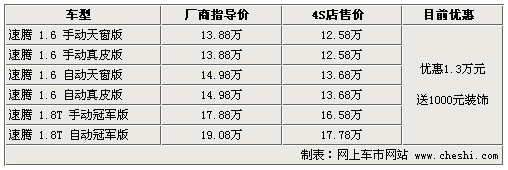 據4S店銷售人員介紹:目前速騰全系優惠1.3萬元,較之前優惠幅度有所增加,如在店內做一條龍服務還可獲贈價值1000元的裝飾,裝飾主要包括腳墊、座套等。由于2.0升車型停產,所以目前只有1.6升和1.8TSI車型。1.6升車型更注重經濟型,而1.8TSI更加注重動力表現。