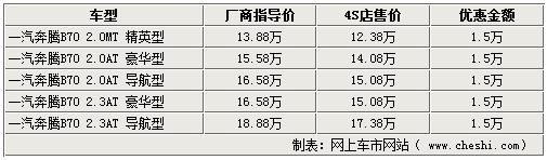 談及老款B70車型,各家銷售人員均表示北京個各展廳內09款奔騰B70現車充足,店內現車近段時間優惠幅度較大,全系車型均可以給出1.5萬元的優惠,相比前一段時間的1.1萬元優惠幅度有所提升。現階段銷售較快的型號主要是2.0L的導航版車型,以及2.3L高配的兩款車型。