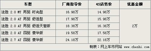 北京現代途勝SUV是國內銷售較早的SUV車型,上市之初銷量一直在SUV市場一枝獨秀,但隨著同級車的競爭加大,途勝也面臨更新換代,預計新款將在明年推出。目前在售的車型可以優惠2萬元現金,具體行情如下:
