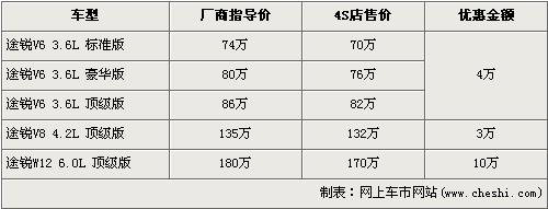 途銳是大眾首款引進(jìn)我國(guó)的SUV車型,在3.6L及4.2L率先上市后,大眾為了滿足消費(fèi)者的更大胃口,緊接著又推出了搭載12缸發(fā)動(dòng)機(jī)的6.0L車型。隨著大排量消費(fèi)稅的頒布,給9月份后入關(guān)的大排量車型帶來了一次不小的沖擊,令大排量汽車價(jià)格都上調(diào)了不少,大眾途銳6.0L頂級(jí)版也從原來158萬元的價(jià)格上調(diào)至了180元。近日據(jù)網(wǎng)上車市價(jià)格系統(tǒng)監(jiān)測(cè)顯示,大眾途銳全系的最高優(yōu)惠達(dá)到了10萬元,具體詳情請(qǐng)看下表: