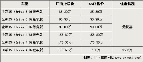 據經銷商處銷售人員介紹,店內還有一批售價為173.6萬元的08款X5 4.8i豪華版現車,目前此批車有35.6萬元的優惠,經優惠后售價降到了138萬元。銷售人員還介紹,新款的X5全系沒有現車,欲購買者需交訂金10萬元,約等2個月才可提車。