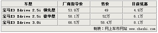 繼X5成功的引進(jìn)我國后,寶馬又將其X系列旗下的緊湊型SUV寶馬X3帶到了中國。目前國內(nèi)在售的X3 2.5Si與X3 3.0si是在X3基礎(chǔ)上衍生而成的運(yùn)動版車型,將寶馬特有的靈敏性與運(yùn)動型多用途車的廣泛實(shí)用性完美結(jié)合。近日據(jù)網(wǎng)上車市價格數(shù)據(jù)監(jiān)測顯示,寶馬X3全系最高有近8.1萬元的現(xiàn)金優(yōu)惠,具體詳情請看下表: