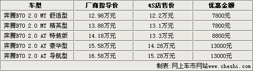 據一汽奔騰汽車4S店銷售人員介紹,目前09款奔騰B70現車顏色不全,主要以銀色車型為主,目前手動擋車型只能優惠7800元;上市不久的自動特裝版能夠優惠8800元;而另外兩款自動擋車型現在能夠優惠13000元,如果到店還能有更多的優惠政策。2010款奔騰將于九月中下旬推出,目前能夠接受預訂,訂金為5000元。