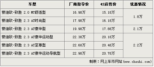 福特蒙迪歐-致勝出自福特最新開發(fā)的EUCD技術(shù)平臺,它采用了沃爾沃S80底盤技術(shù)。在歐洲,蒙迪歐致勝與皇冠成為競爭對手,是一款定位高于雅閣、凱美瑞之流的轎車。近日據(jù)網(wǎng)上車市價格系統(tǒng)檢測顯示,蒙迪歐-致勝全系最高優(yōu)惠2.2萬元,具體車型價格詳情請看下表: