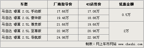 據一汽馬自達4S店銷售人員介紹,馬自達6睿翼目前全系車型最高可以優(yōu)惠現(xiàn)金2萬元,2.5排量三款車優(yōu)惠后最低僅售19.68萬,其中2.0排量車型目前也可以優(yōu)惠現(xiàn)金5千元。本月底經銷店內有黑色、銀色、紫色等現(xiàn)車供應。