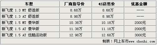 廣汽本田新飛度一直以時尚的外觀,經濟的油耗和精細的內飾做工贏得了不少年輕都市白領的認可。根據網上車市價格監測系統顯示,目前新飛度最高優惠3千元左右,1.3L車型需預訂。具體車型行情如下: